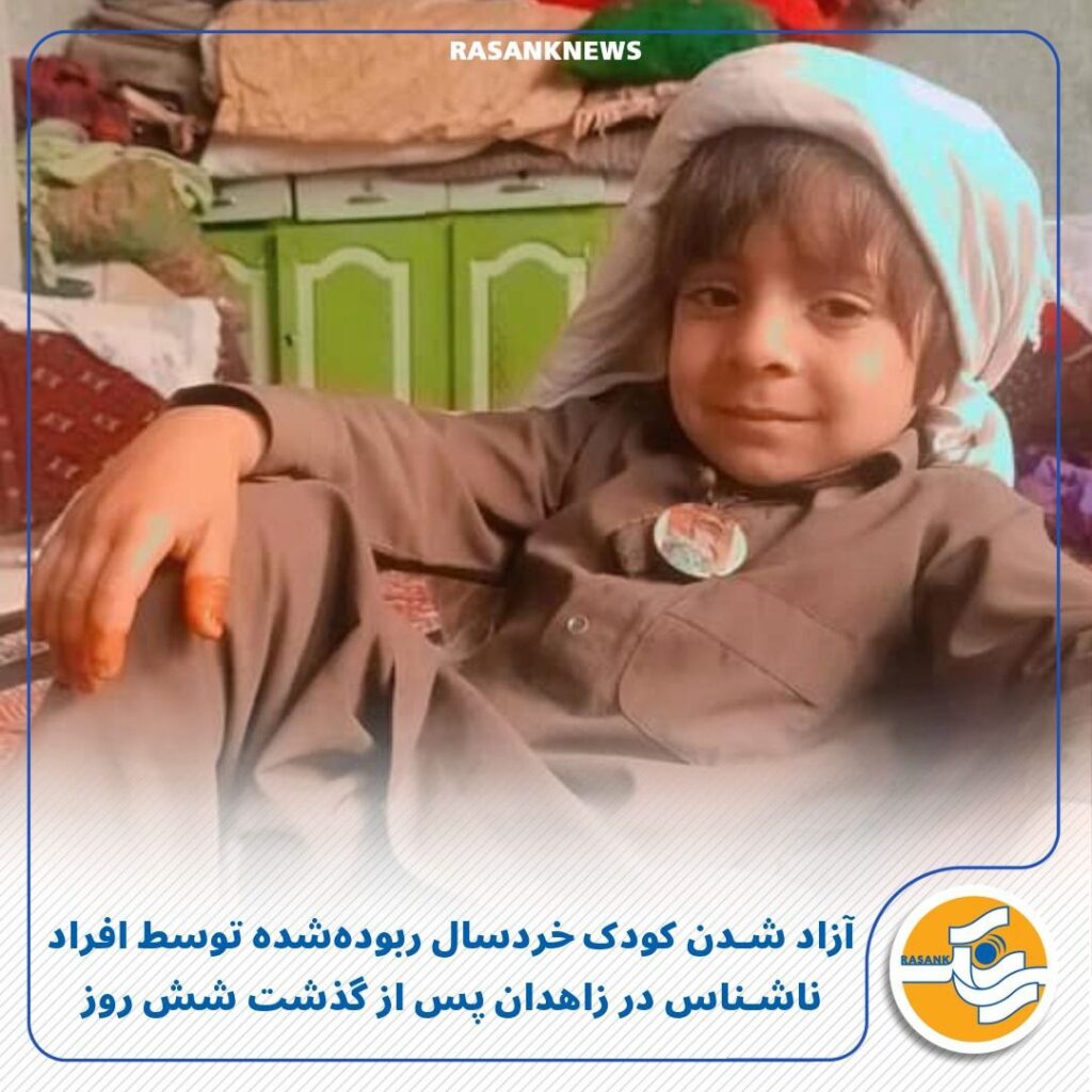 به گزارش رسانک، روز جمعه ۱۱ مهر ماه ۱۴۰۴، یک کودک پنجساله ساکن منطقه شیرآباد زاهدان که شامگاه گذشته ۵ مهر ماه، حوالی ساعت ۱۸:۳۰ دقیقه توسط افراد ناشناس که سرنشینان یک خودروی پژو ۴۰۵ ربوده شده بود، پس از شش روز از چنگ ربایندگان آزاد شد.