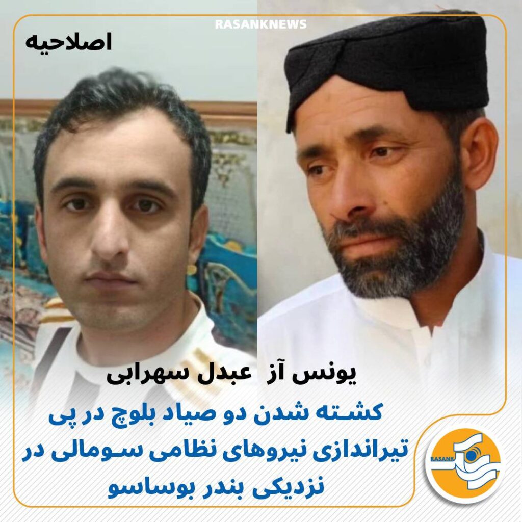 هویت این صیادان بلوچ «عبدل سهرابی»، ۳۳ ساله، فرزند قادربخش، متاهل و دارای چهار فرزند و اهل روستای چشی از توابع شهرستان کنارک و «یونس آز»، فرزند چهارشنبه، مجرد و اهل شهر کنارک توسط رسانک محرز شده است.
