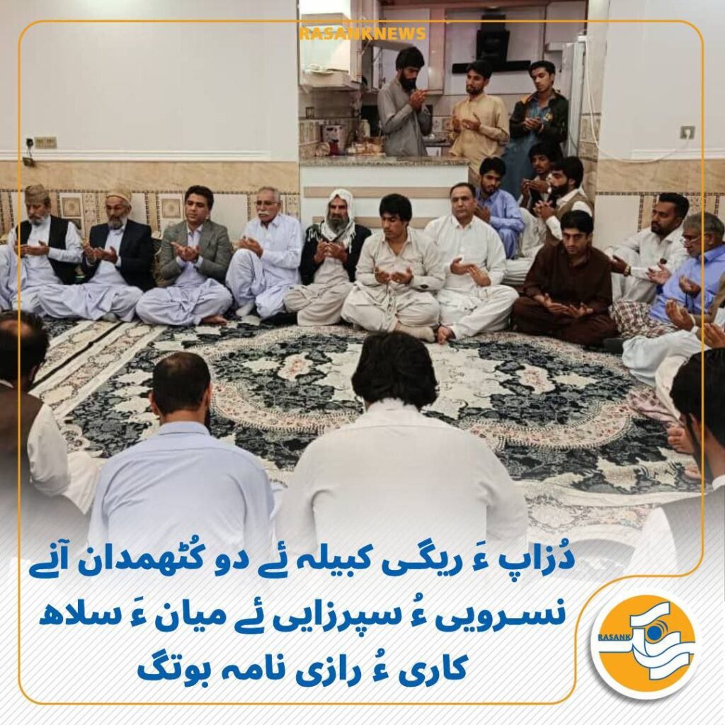 رَسانک نیوز/ 3 آبان ماہ 1404 ءَ، دُزاپ ءَ ریگی کبیلہ ئے دو کُٹھمدان سپرزایی ءُ نسرویی ءِ لہتیں ورنایانی میان ءَ اَڑ ءُ جیڑ گوں کبیلہ ءِ کماش ءُ سروکیں مردمانی جُھد ءُ میانجی گری ءَ، پہ رازی نامہ ءُ سلاھ کاری ءَ آسر بوتگ۔ اے دیوان گوں براتی ءُ دوستی ئے ماھولی ماں نزر ریگی (نسرویی) ءِ پتّر ءَ برجم دارگ بوتگ. دیوان ءَ دوئیں کٹھمدان آن ءَ پہ آرام بوھگ ءُ تپاکی ئے گیش کنگ ءُ یکّادگرا اِزّت ءُ اھترامئے دیگ ءَ زور داتگ۔ پیش اَتکگیں جیڑہ آں گوں ایمنی ءَ آسر بوتگ اَنت.