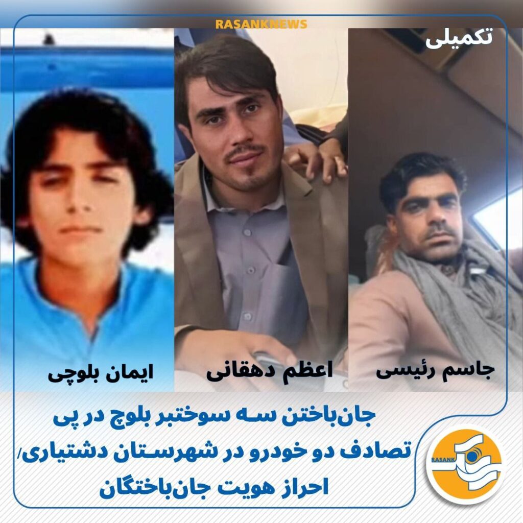هویت این سوختبران، «جاسم رئیسی» فرزند نظرمحمد معروف به نظیر، متاهل و دارای فرزند و اهل روستای کجوم از توابع شهرستان سرباز، «ایمان بلوچی»، ۱۳ ساله و دانشآموز، فرزند حلیم و «اعظم دهقانی»، فرزند محمدعلی، هر دو اهل روستای گزمنزل واقع در بخش باهوکلات از توابع شهرستان دشتیاری توسط رسانک محرز شده است.