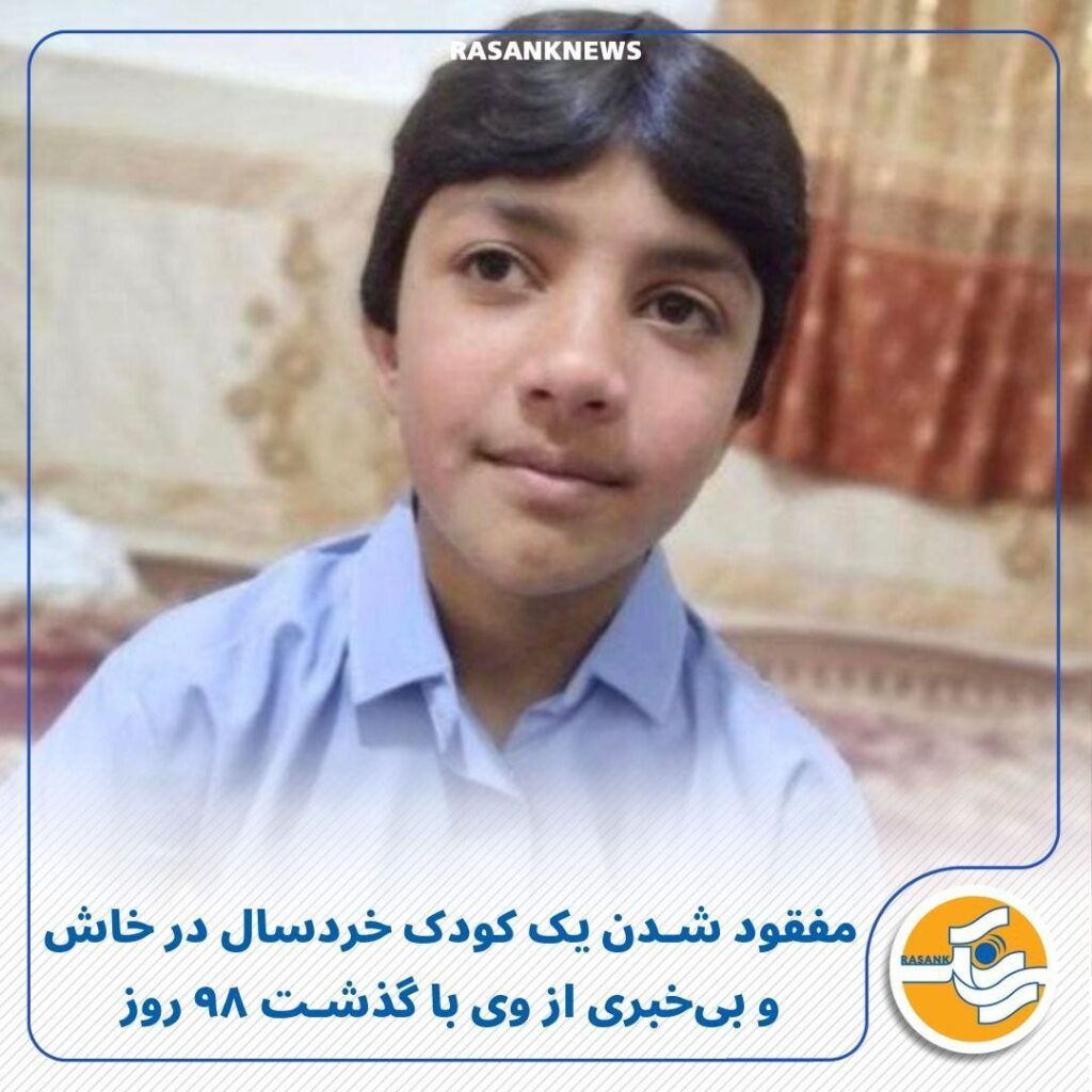 به گزارش رسانک، امروز شنبه ۱ آذر ماه ۱۴۰۴، یک کودک خردسال به نام «محمد تاجیک»، فرزند میرویس و نوه امان (سیم‌کش) از چهارراه پشتکوه خاش که ۹۸ روز پیش، در تاریخ ۲۴ مرداد ماه برای اقامه نماز جمعه به مسجد رفته اما پس از آن دیگر به خانه بازنگشته است. از آن روز تاکنون هیچ اطلاعی از سرنوشت او در دست نیست و نگرانی خانواده هر روز بیشتر شده است.