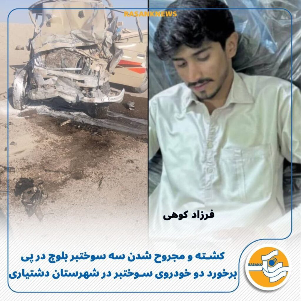 به گزارش رسانک، روز گذشته ۴ آذر ماه ۱۴۰۴، در پی برخورد شدید دو خودروی سوختبر در مسیر مرز ریمدان واقع در شهرستان دشتیاری، یک سوختبر بلوچ جان خود را از دست داد و دو سوختبر دیگر نیز مجروح شدند.