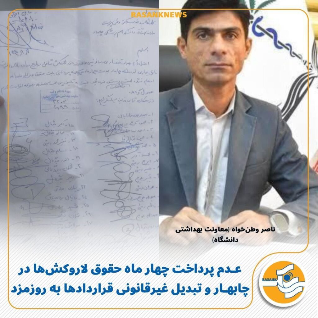 این نیروها که تعدادشان حدود هفتاد نفر عنوان شده به خبرنگار رسانک گفتهاند: تمامی مراحل اداری برای جذب قانونی آنان انجام شده و حتی مجوز وزارتخانه نیز صادر شده بود، اما معاونت توسعه دانشگاه چابهار به ریاست دکتر «ناصر وطنخواه»، قراردادهایی را تنظیم کرده که هیچ بند استخدامی در آن وجود ندارد و برخلاف روال قانونی، قرارداد ۸۹ روزهای که باید در مرتبه دوم به قرارداد یکساله تبدیل شود، به قرارداد روزمزد تغییر یافته است. آنان همچنین میگویند در حالی که فهرست واقعی نیروهای لاروکش هفتاد نفر است، امور مالی از ارسال لیستی ۱۲۰ نفره خبر داده که گفته میشود شامل افراد وابسته به مسئولان دانشگاه و برخی نمایندگان است و تلاشهایی پشت پرده برای جایگزینی این نیروهای بومی با افراد سفارشی صورت میگیرد.