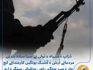 دُزاپ ءَ سپاہ ءِ ٹولی ئے سرا سلاہ بندیں مردمانے اُرش ءَ کُشگ بوتگیں کارمندانے کَچ چار ءَ سر بوتگ، راجی پدائیانی سنگر ءَ اے اُرش ءِ زمّہ واری منّتگ