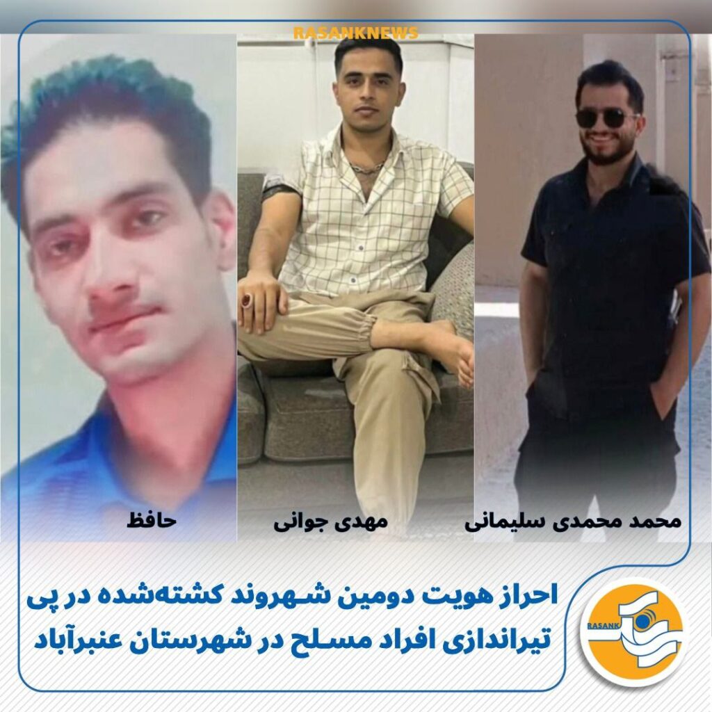 هویت دقیق شهروند کشتهشده دوم، «محمد محمدی سلیمانی (رودباری)»، اهل شهرستان جیرفت توسط رسانک محرز شده و پیشتر هویت یکی از کشتهشدگان، «مهدی جوانی» و هویت شهروند مجروحشده با نام «حافظ»، هر دو اهل شهرستان عنبرآباد احراز شده بود.