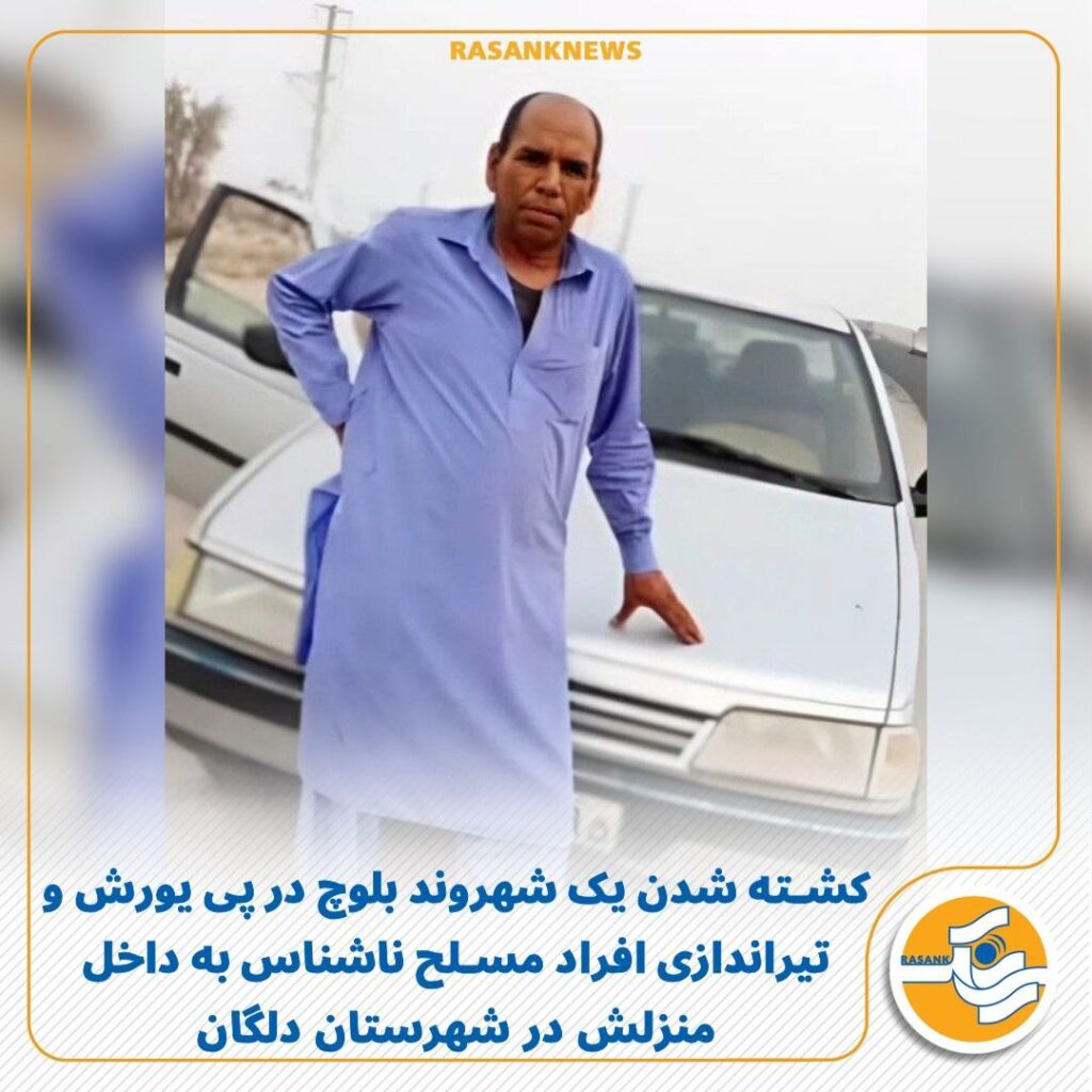 به گزارش رسانک، روز پنجشنبه ۲۰ آذر ماه ۱۴۰۴، یک شهروند بلوچ در شهرستان دلگان پس از یورش و تیراندازی چند فرد مسلح ناشناس به منزل مسکونیاش کشته و ساعاتی بعد جسد او در داخل خودروی شخصیاش در روستای گزگر از توابع دلگان توسط مردم محلی کشف شد.
