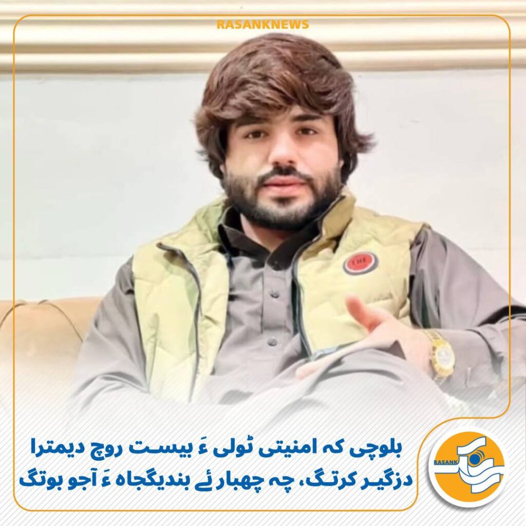 رَسانک نیوز/ دوشمبے روچ 24 آزر ماہ 1404 ءَ، «سلمان آسکانی»، نامیں بلوچی کہ ماں تاریک 4 آزر ماہ ءِ شپ ءَ امنیتی ٹولی ءَ چہ چھبار ءِ امام ھمینی روڈ ءَ بے سرکارئے ھُکم ءَ دزگیر کرتگ، کِساس 20 روچ بندیگ بوھگ ءَ پد زمانت ئے سرا چہ چھبار ئے بندیگجاہ ءَ آجو بوتگ.