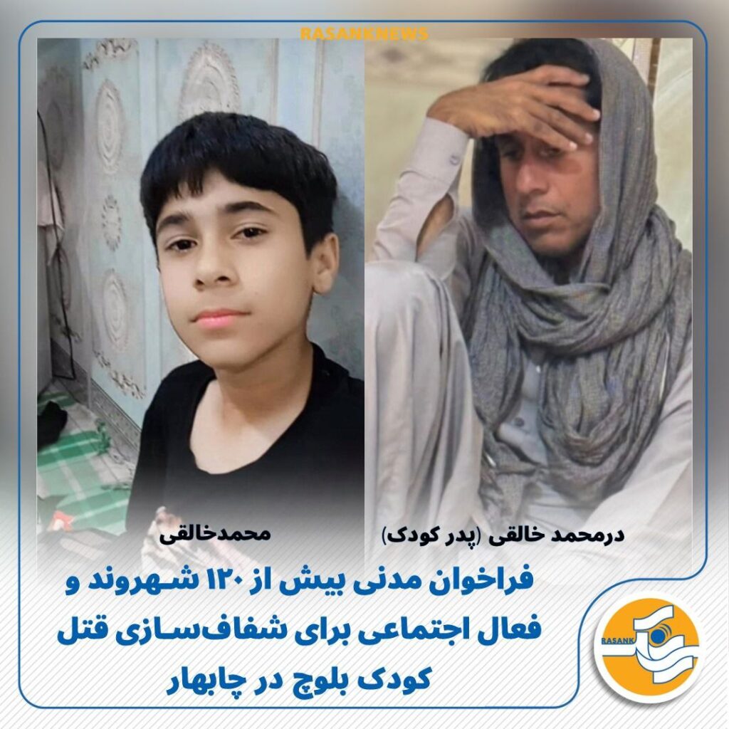 به گزارش رسانک، امروز سه‌شنبه ۲۵ آذر ماه ۱۴۰۴، بیش از ۱۲۰ نفر از شهروندان، فعالان اجتماعی و مدنی، استادان دانشگاه و کنشگران فرهنگی با امضای یک بیانیه و فراخوان مدنی، خواستار شفاف‌سازی فوری و پاسخ‌گویی مقامات و نهادهای امنیتی و مسئول در شهرستان چابهار درباره قتل «محمد خالقی»، کودک بلوچ، شده‌اند.