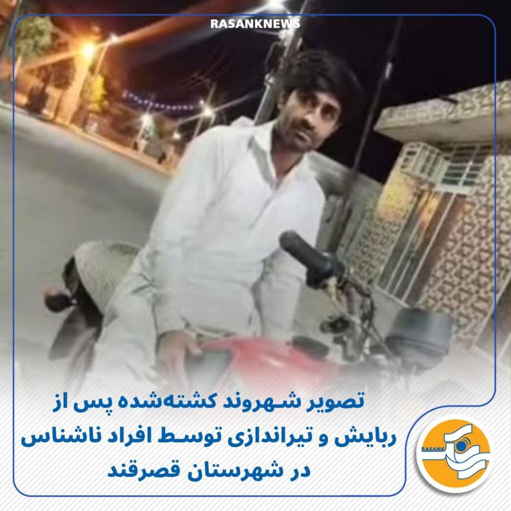 به گزارش رسانک، شامگاه گذشته ۲۵ آذر ماه ۱۴۰۴، سه فرد مسلح که سرنشین یک خودروی پژو ۴۰۵ بودند با یورش به مغازه یک شهروند بلوچ در روستای حمیری از توابع شهرستان قصرقند، وی را پس از ضربوجرح شدید بهزور سوار خودرو کرده و از محل ربودهاند که امروز ۲۶ آذر ماه، پس از پیگیری خانواده و اهالی، پیکر بیجان این شهروند با آثار اصابت گلوله در زیر یک پلی در شهرستان نیکشهر پیدا شده است.