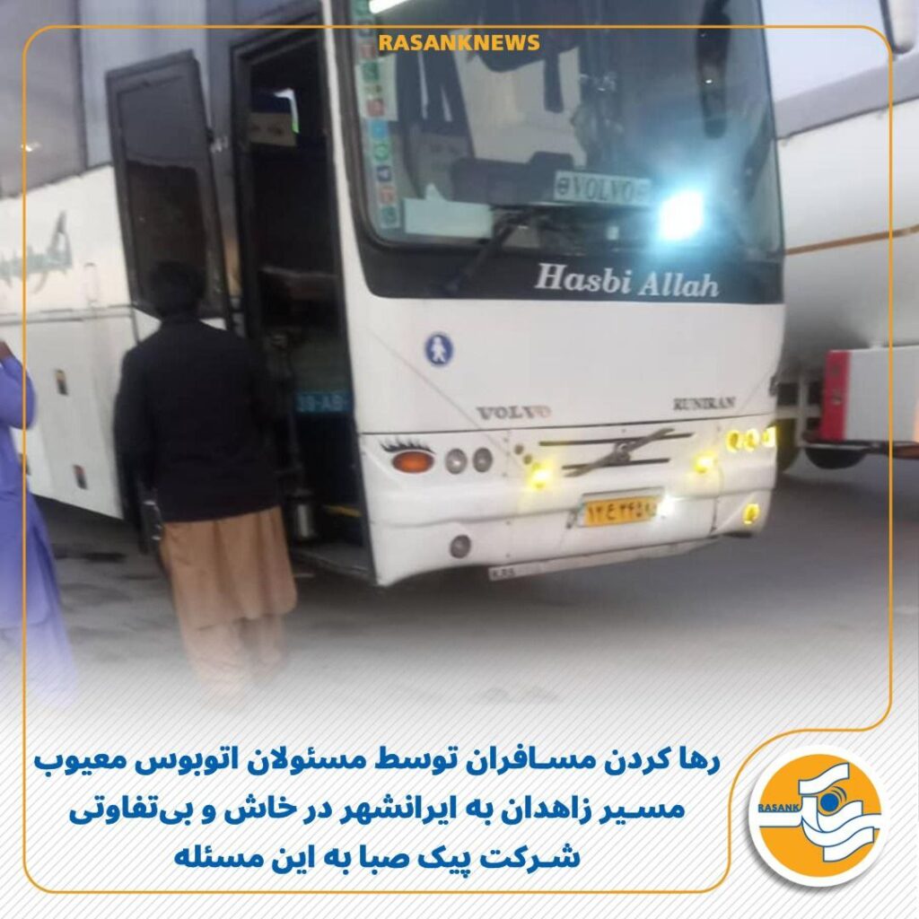 به گزارش رسانک، روز چهارشنبه ۳ دیماه ۱۴۰۴، یک دستگاه اتوبوس متعلق به شرکت تعاونی پیک صبا که از زاهدان به مقصد ایرانشهر حرکت کرده بود، با وجود نقص فنی از مبدأ زاهدان مسافرگیری کرده و بدون انجام بررسیهای لازم فنی وارد مسیر شده است. این اتوبوس در ادامه مسیر و در شهر خاش دچار خرابی شده و راننده تمامی مسافران را در کنار جاده پیاده کرده و آنان را بدون رسیدگی رها کرده است.