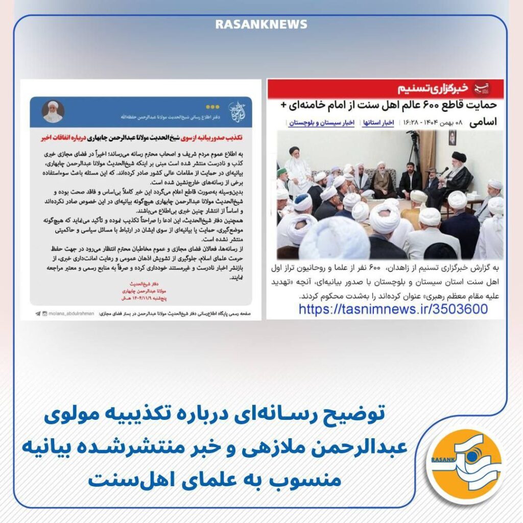 خبرگزاری رسانک پس از انتشار تکذیبیه رسمی مولوی عبدالرحمن ملازهی، خود را موظف دانسته است که این ادعای دفتر وی را منتشر کند. این اقدام در چارچوب اصول حرفهای رسانهای و امانتداری خبری انجام شده و به معنای تکمیل روایت برای مخاطب و نه نادیدهگرفتن خبر اولیه میباشد.