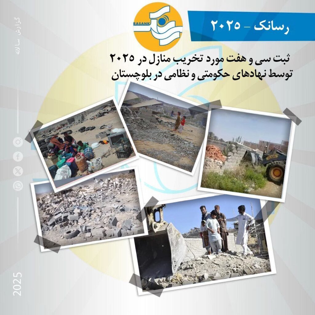 به گزارش رسانک، در سال ۲۰۲۵، موارد متعددی از تخریب اجباری منازل و اموال شهروندان بلوچ در مناطق مختلف بلوچستان ثبت شده است. این اقدامات عمدتاً توسط نهادهای حکومتی و اجرایی، از جمله شهرداریها، بنیاد مسکن و نیروهای نظامی و امنیتی انجام شده و در بسیاری از موارد، بدون رعایت حداقل تضمینهای قانونی و حقوقی صورت گرفته است.