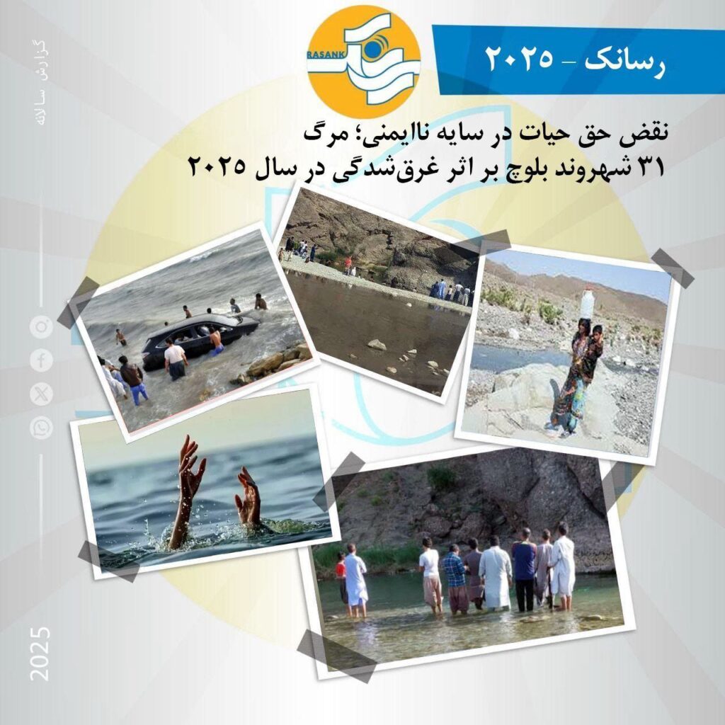 به گزارش رسانک، در سال ۲۰۲۵، موارد متعددی از غرق‌شدگی شهروندان بلوچ در مناطق مختلف بلوچستان ثبت شده است. اگرچه همه این موارد لزوماً به‌طور مستقیم مصداق نقض حقوق بشر محسوب نمی‌شوند، اما عدم انجام اقدامات پیشگیرانه، فقدان زیرساخت‌های ایمن و قصور نهادهای مسئول در بسیاری از این موارد، به شرایطی انجامیده است که می‌توان آن‌ها را در چارچوب نقض حق حیات مورد بررسی قرار داد.
