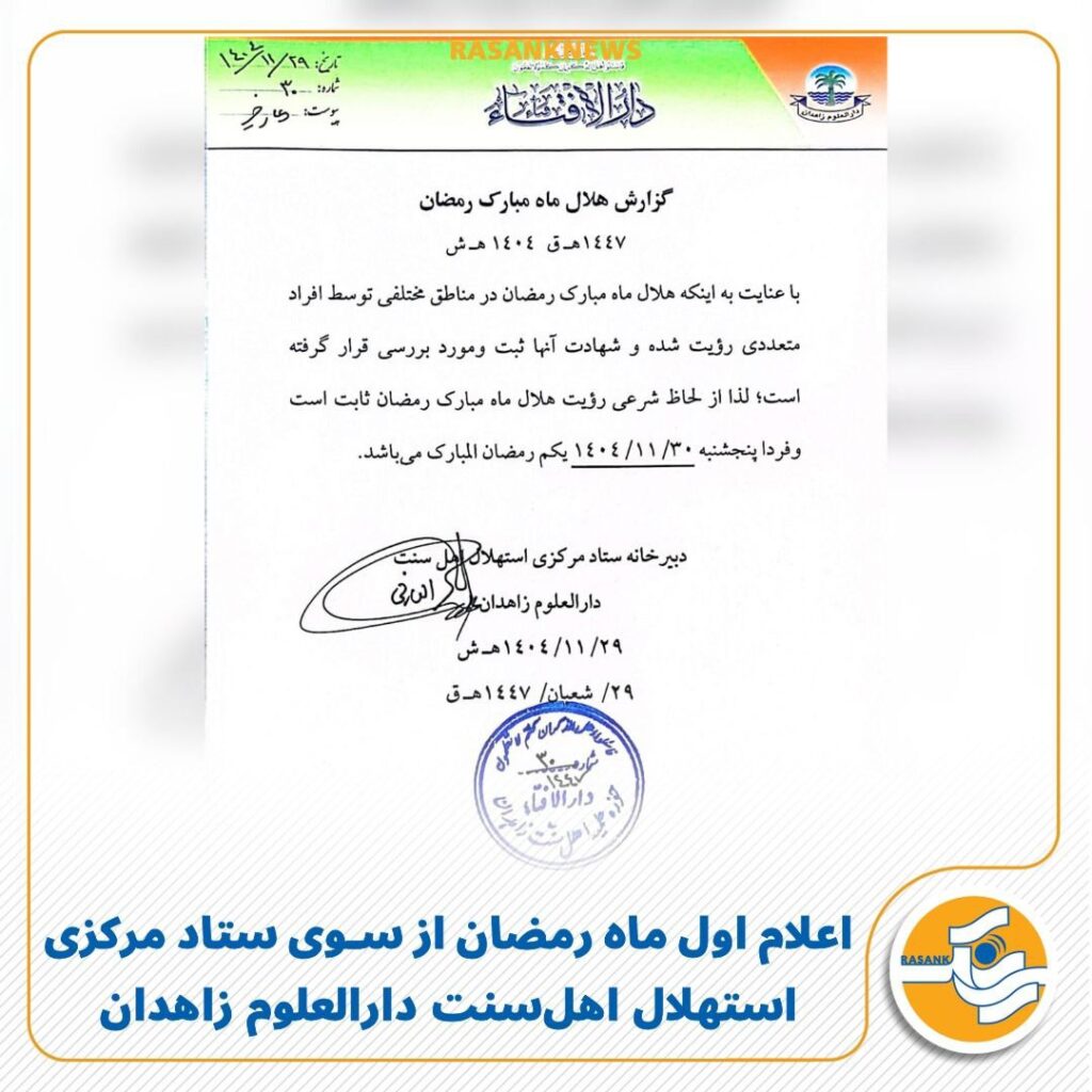 به گزارش رسانک، شامگاه امروز چهارشنبه ۲۹ بهمن‌ماه ۱۴۰۴، دبیرخانه ستاد مرکزی استهلال اهل‌سنت دارالعلوم زاهدان با صدور اطلاعیه‌ای اعلام کرد که هلال ماه رمضان در مناطق مختلف توسط افراد متعددی رؤیت شده و پس از ثبت و بررسی شهادت‌ها، این رؤیت از نظر شرعی ثابت شده است؛ بر همین اساس فردا ۳۰ بهمن‌ماه ۱۴۰۴، یکم رمضان‌ ۱۴۴۷ هجری قمری خواهد بود.