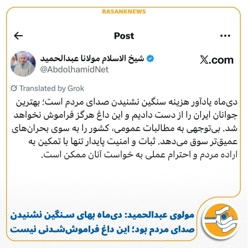 به گزارش رسانک، امروز سهشنبه ۵ اسفندماه ۱۴۰۴، مولوی عبدالحمید اسماعیلزهی، امامجمعه زاهدان با انتشار پیامی در شبکه اجتماعی ایکس، نسبت به پیامدهای نادیده گرفتن مطالبات عمومی مردم هشدار داد و وقایع دیماه را «هزینهای سنگین» برای کشور توصیف کرد.
